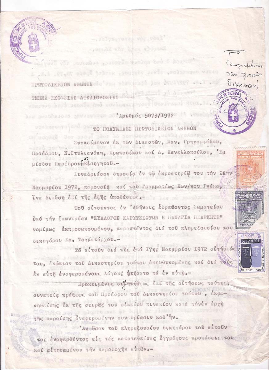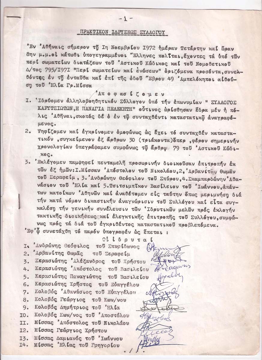 Με το πέρασμα των χρόνων και την αύξηση του αριθμού των Καρυτσιωτών στην Αθήνα αποφασίστηκε να ιδρυθεί σύλλογος Καρυτσιωτών με έδρα την Αθήνα. Την 1η Νοεμβρίου του 1972 συγκεντρώθηκαν 27 Καρυτσιώτες στο κατάστημα του Ηλία Γρηγ. Μίσσα στους Αμπελοκήπους (‘Έβρου 49) και υπέγραψαν το “Πρακτικό Ιδρύσεως του Συλλόγου”. Ακολούθως με την υπ΄αριθμ. 5073/12-12-1972 απόφαση του Πολυμελούς Πρωτοδικείου Αθηνών ιδρύθηκε νόμιμα ο σύλλογος με την επωνυμία: “ΣΥΛΛΟΓΟΣ ΚΑΡΥΤΣΙΩΤΩΝ Η ΠΑΝΑΓΙΑ ΠΕΛΕΚΗΤΗ” με έμβλημα στη σφραγίδα του απεικόνιση της μονής και με πρώτη –προσωρινή- διοικούσα επιτροπή αποτελούμενη απ΄ τους Απόστολο Νικ. Μίσσα, Θωμά Σεραφ. Αρβανίτη, Θεόφιλο Σπυρ. Ανδρώνη , Αθανάσιο Ηλ. Σκαμπαρδώνη και Βασίλειο Ιωαν. Τσιτσιμπίκο.